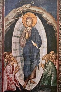 L’iconografo conosce bene questo simbolo che rappresenta solitamente come una successione di cerchi concentrici, alcuni luminosi, altri di un blu profondo, arricchiti di raggi e stelle d’oro. La buona pittura riesce a conferire anche al colore scuro una trasparenza come un cielo nelle notti d’oriente o come un’acqua profonda. È quel simbolo che avvolge il Cristo che scende agli inferi, che viene a prendere l’anima di Maria nella Dormizione, oppure quando è seduto nel suo trono di Gloria.